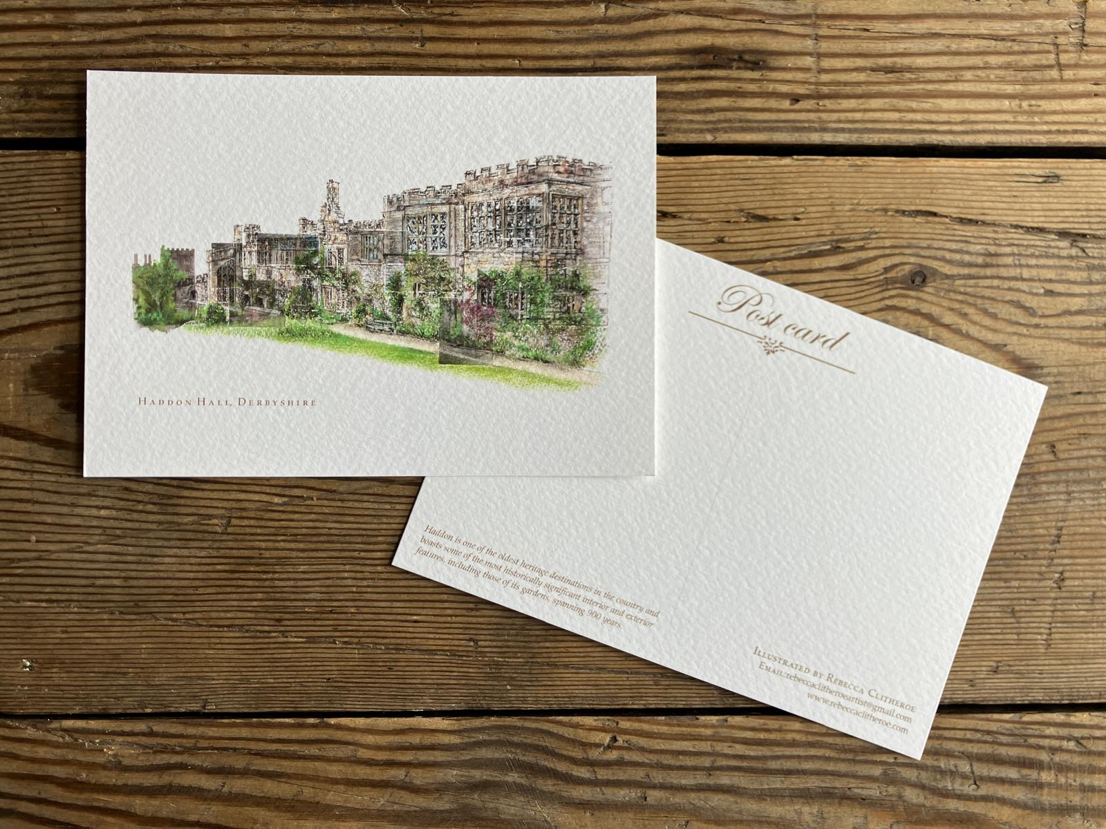 Mini Print of Haddon Hall, Bakewell by Rebecca Clitheroe in postcard format.