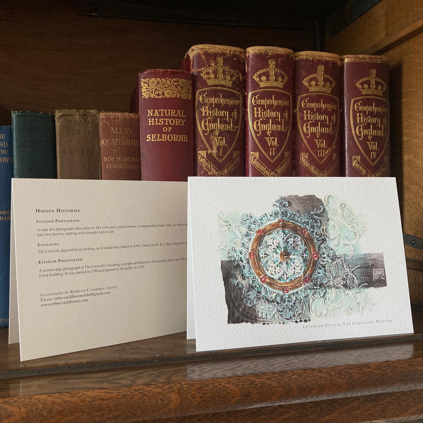 Folded card of Interior Detail, Buxton by Rebecca Clitheroe with Hidden Histories on reverse.
